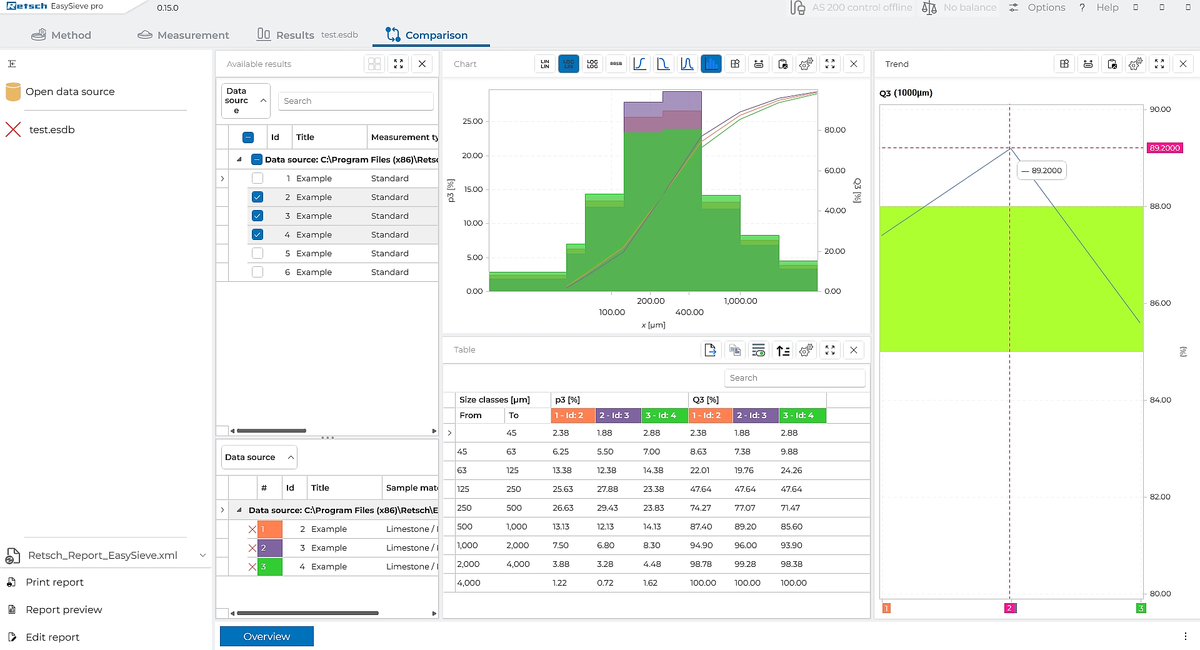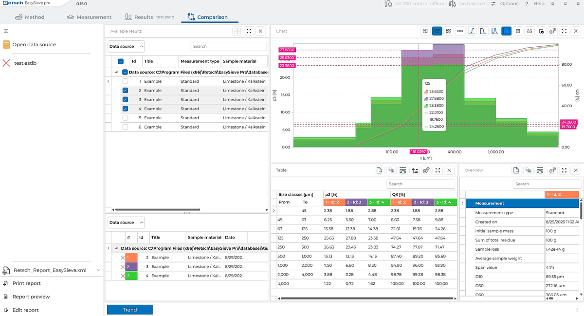 Trend analysis allows you to always keep an eye on your sieve analyses. By comparing several sievings using freely selectable parameters, you can identify deviations at an early stage and ensure your quality standards are maintained – easily and reliably.